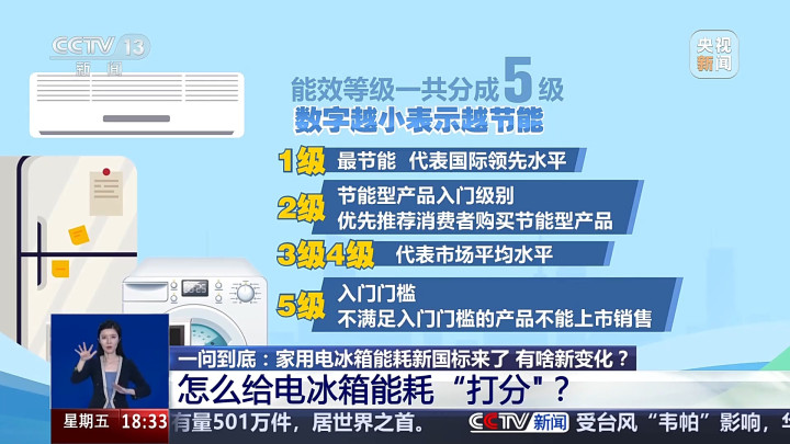 中国标准化研究院研究员成建宏:从耗电量的指标来看,应该说大概提高了30%到40%,尤其咱们主流的产品,像冷藏冷冻电冰箱提高的幅度会大一些,整体上应该说可以为消费者节约40%左右的电。